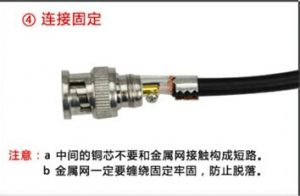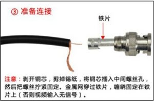 將視頻線剝開,剪掉錫紙,并將銅芯上的絕緣殼剪掉,留出部分銅芯線,屏蔽層的金屬擰成另一條線;把Q9接頭的套筒擰下來,用螺絲松開接頭上的螺絲,將套筒套到視頻線上,視頻線同心軸插到接頭的同心孔,螺絲擰緊,并且將金屬網(wǎng)絲穿過鐵片固定到接頭鐵片上,將鐵片包在視頻線上用鉗子夾緊,擰上套筒就完成接頭安裝了,如下圖:
