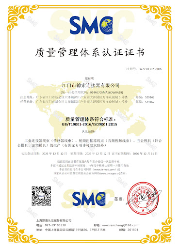 追求卓越品質(zhì),筑牢行業(yè)根基。江門(mén)市德索連接器有限公司具備ISO9001:2015 / GB/T19001-2016 質(zhì)量管理體系認(rèn)證資質(zhì)。這標(biāo)志著公司在管理規(guī)范化、服務(wù)標(biāo)準(zhǔn)化及產(chǎn)品品質(zhì)國(guó)際化進(jìn)程中邁出了堅(jiān)實(shí)的一步!
