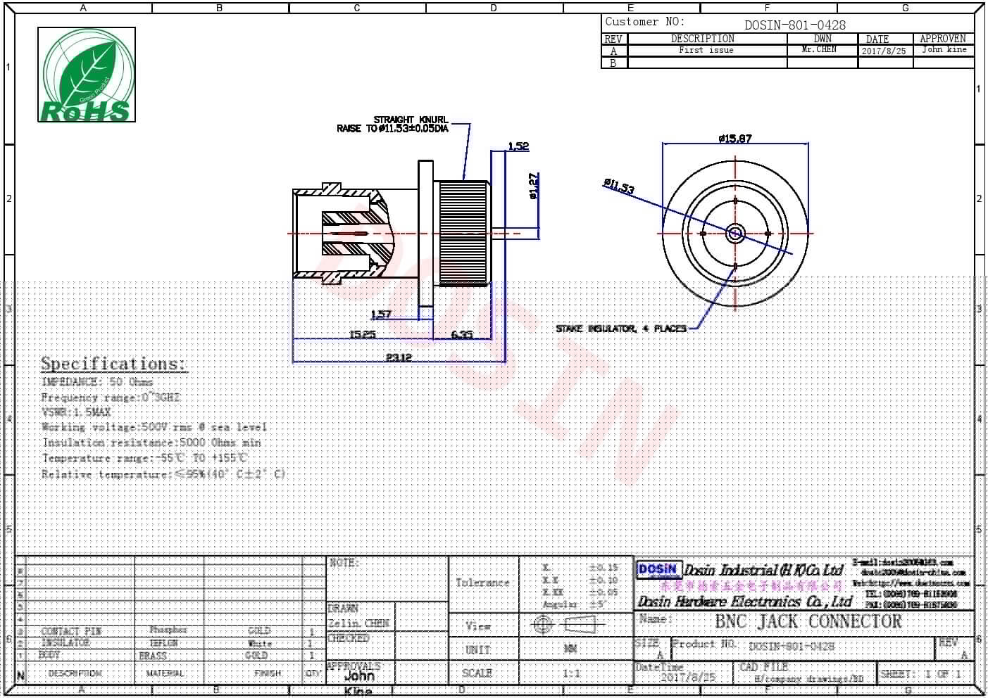 | 電壓駐波比 | 直式 ≦ 1.22/3GHz / 彎式≦ 1.30/3GHz |