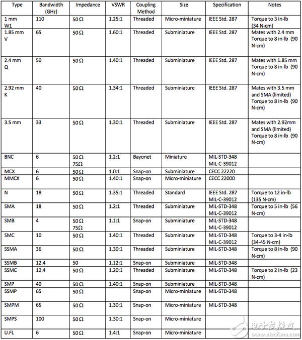 雖然射頻連接器種類眾多,但它們的許多關(guān)鍵參數(shù)不同。這些規(guī)格包括物理尺寸、阻抗、電壓駐波比、接合類型、帶寬或頻率范圍(表 1)。